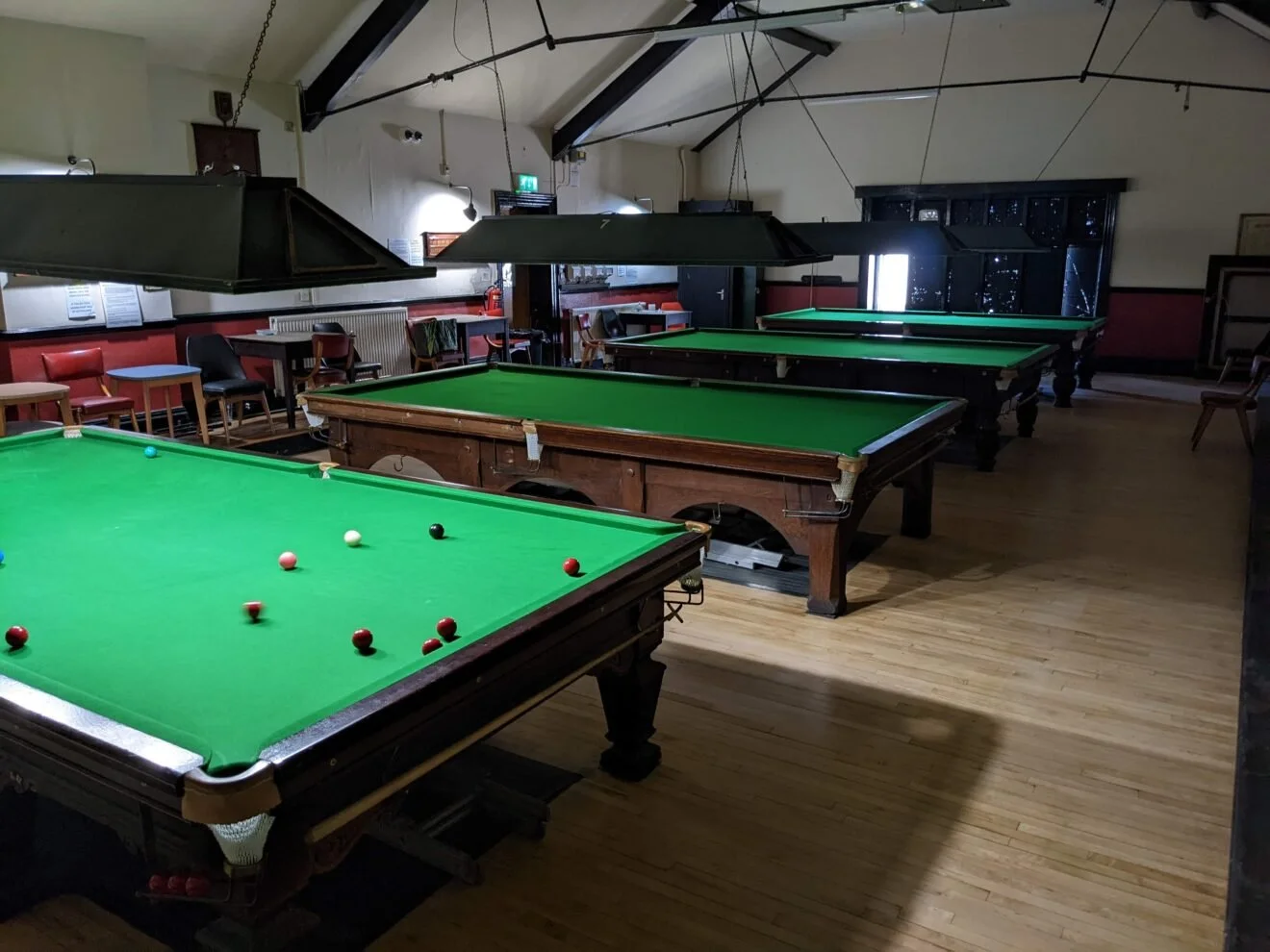 Like the Function Room, the snooker hall has a lovely wooden floor, recently restored to its original finish. There are 4 full-size snooker tables which can be booked by members; there is no booking fee but the lights for each table work out at £6 per hour using the coin-operated wall-mounted machines. Members may only play with other members at snooker, although we will let a guest play on a one-off basis in order to help them decide whether to join.
